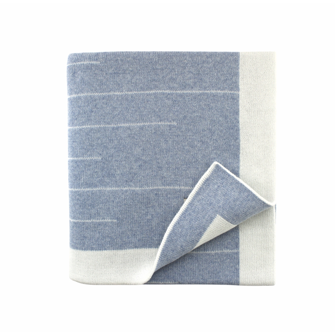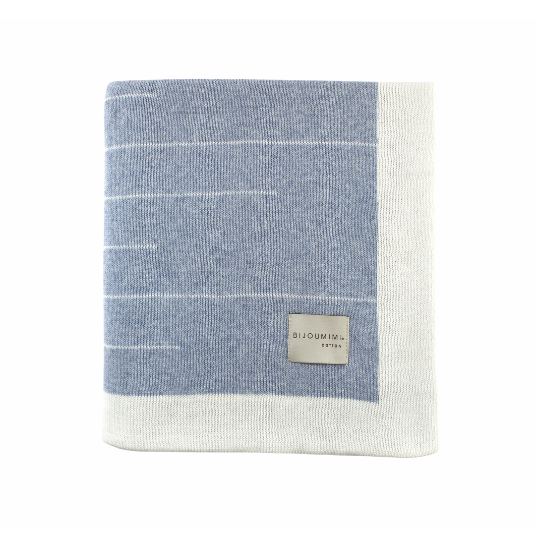 Manta de malha, confecionada em Portugal com algodão orgânico certificado Oeko Tex. Apresenta um tom azul suave, com uma barra em cor crú que contorna todo o desenho, criando um contraste delicado e intemporal. O modelo é reversível, invertendo as cores no verso para um efeito igualmente elegante e versátil. Uma manta perfeita para envolver o bebé nos momentos de descanso ou passeio.