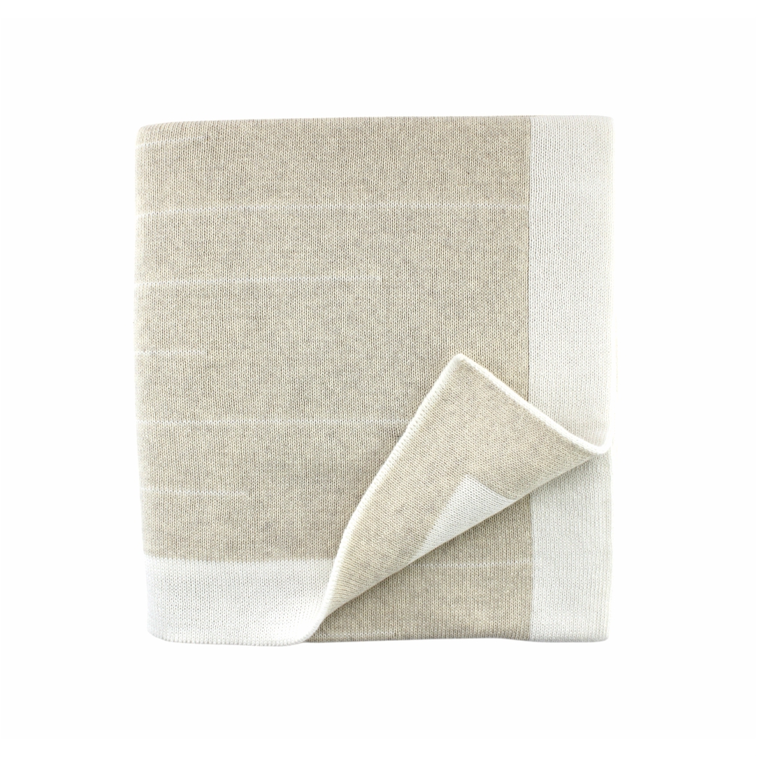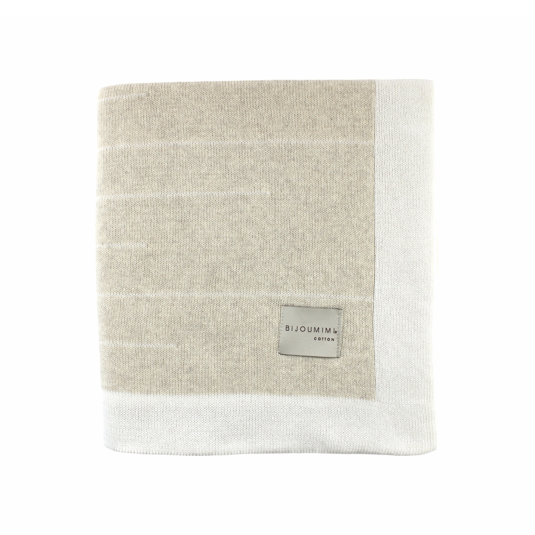 Manta de malha, confecionada em Portugal com algodão orgânico certificado Oeko Tex. Apresenta um tom bege suave, com uma barra em cor crú que contorna todo o desenho, criando um contraste delicado e intemporal. O modelo é reversível, invertendo as cores no verso para um efeito igualmente elegante e versátil. Uma manta perfeita para envolver o bebé nos momentos de descanso ou passeio.
