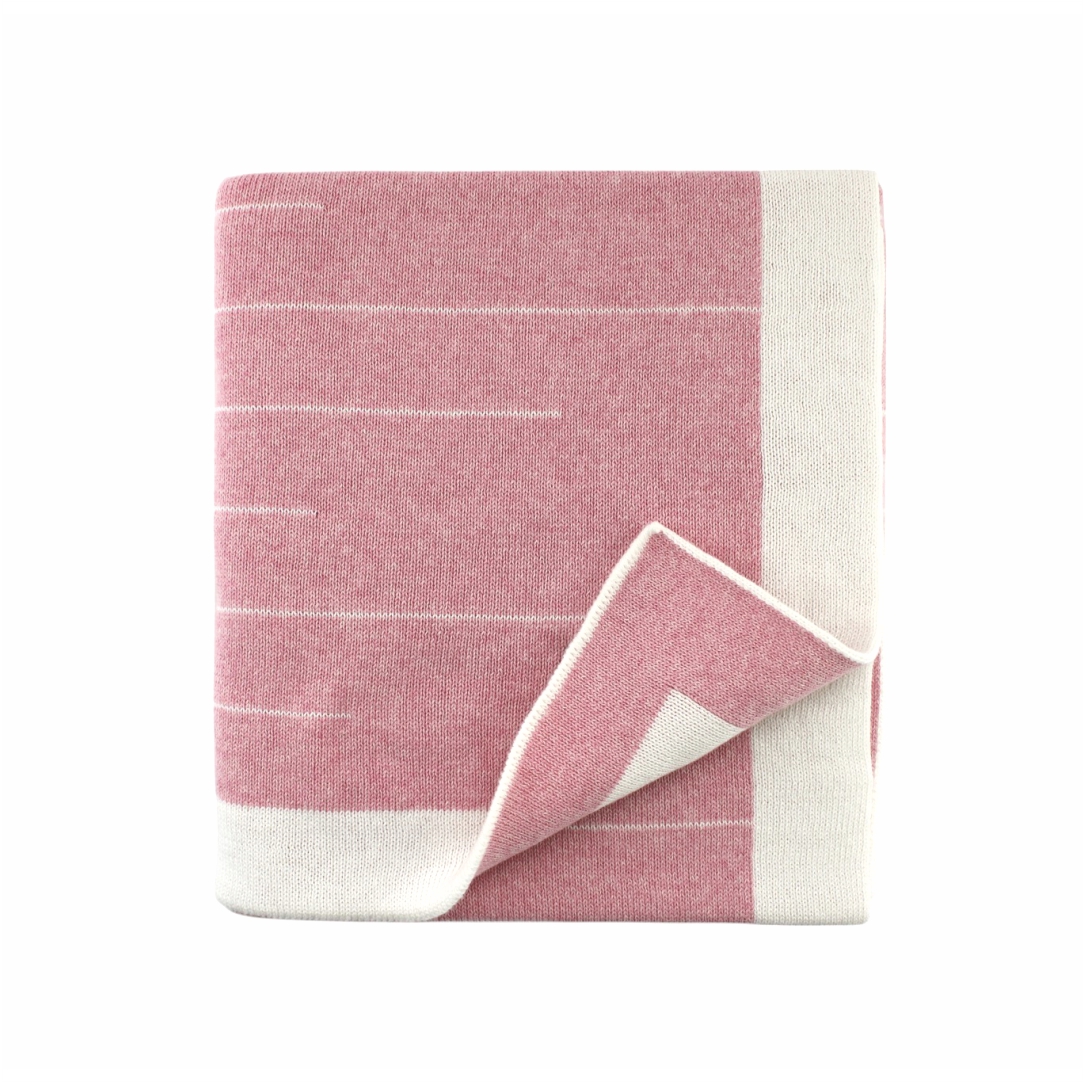 Manta de malha, confecionada em Portugal com algodão orgânico certificado Oeko Tex. Apresenta um tom rosa suave, com uma barra em cor crú que contorna todo o desenho, criando um contraste delicado e intemporal. O modelo é reversível, invertendo as cores no verso para um efeito igualmente elegante e versátil. Uma manta perfeita para envolver o bebé nos momentos de descanso ou passeio.