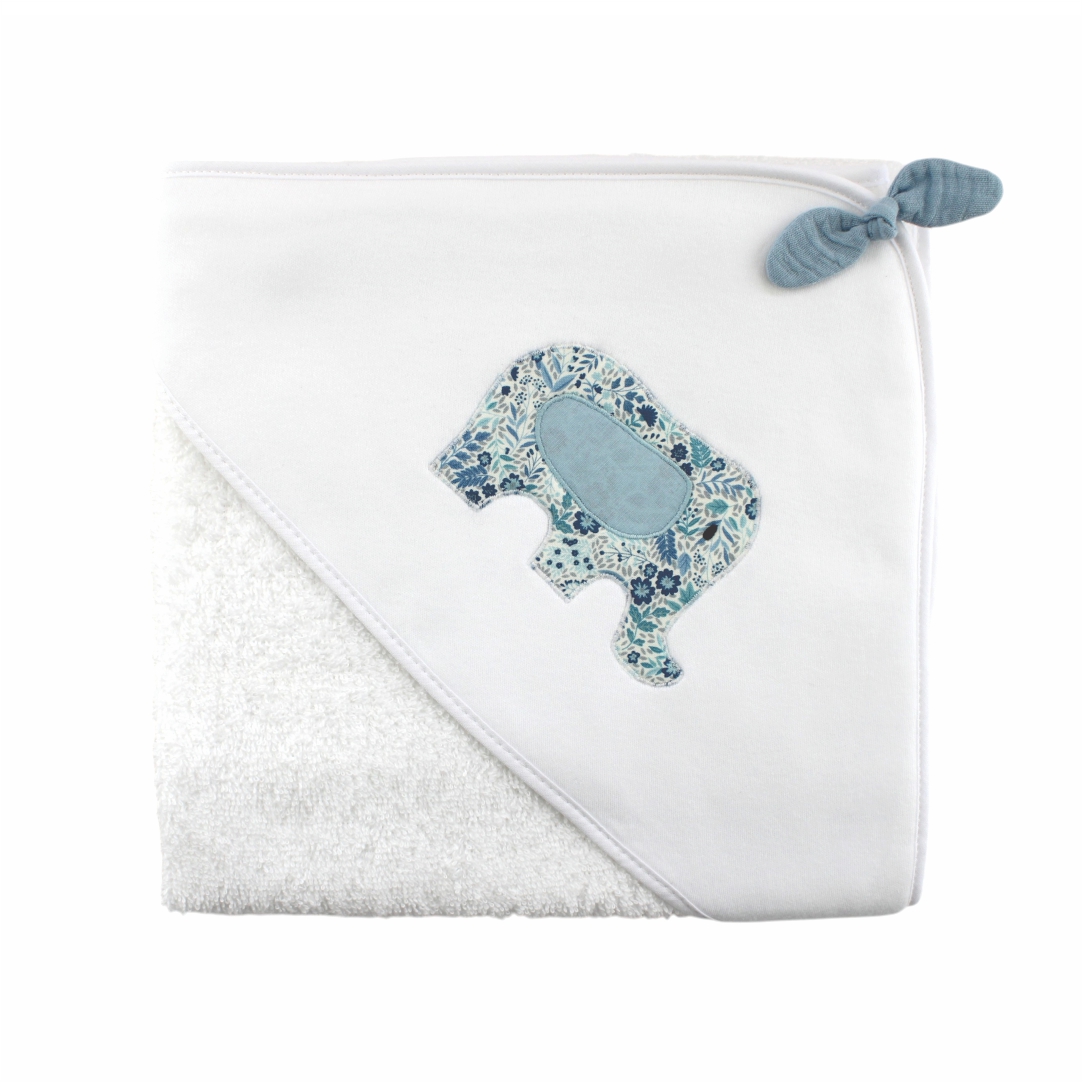Toalha de banho com capuz, em felpo de algodão branco, pensada para envolver o bebé com suavidade e conforto após o banho. Um essencial prático e delicado para os primeiros cuidados.